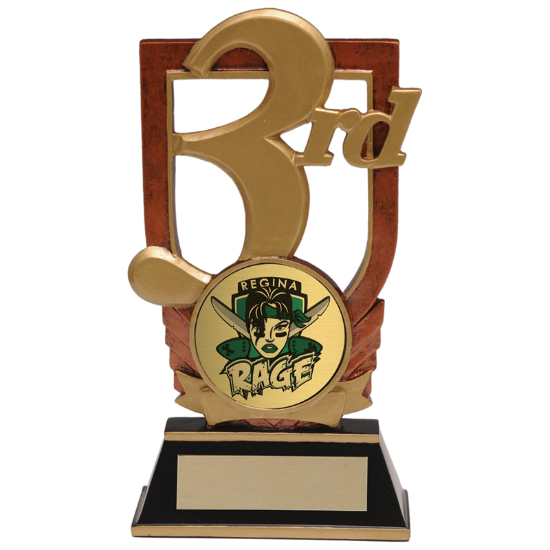 Available in 3 different colours, this award features a large cut-out number with hollow cutouts and a shield-shaped outline. Space for your own custom logo sits at the base of the shield! Choose from goldtone, silvertone, or bronzetone sculpts.