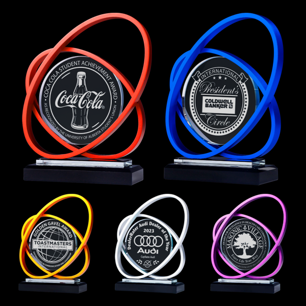 Available in five colours, the Saturn award features a circular glass panel perched atop another layer of glass, all on an elegant, beveled base. The overlapping aluminum frames adds a bright touch, ensuring that all eyes will be drawn to your custom inscription.
