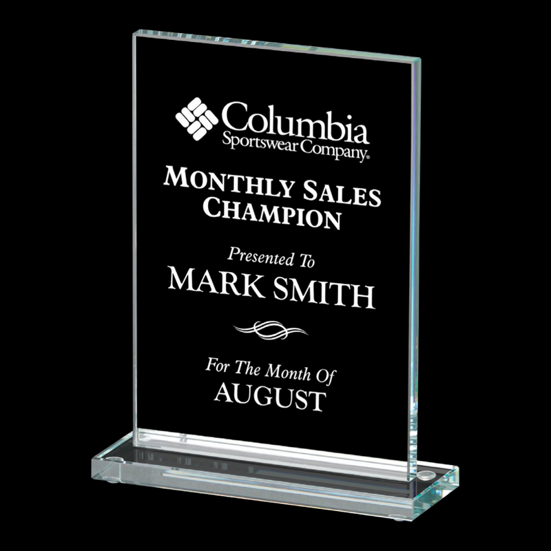 The Stapleton award features a solid glass base, topped with a simply stylish rectangular glass panel to highlight the recipient's amazing achievement, surrounded by a wide, beveled edge. Available in three sizes.