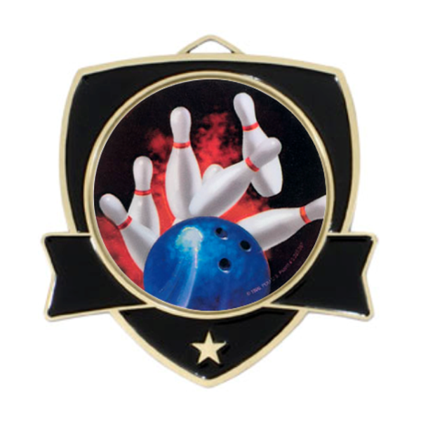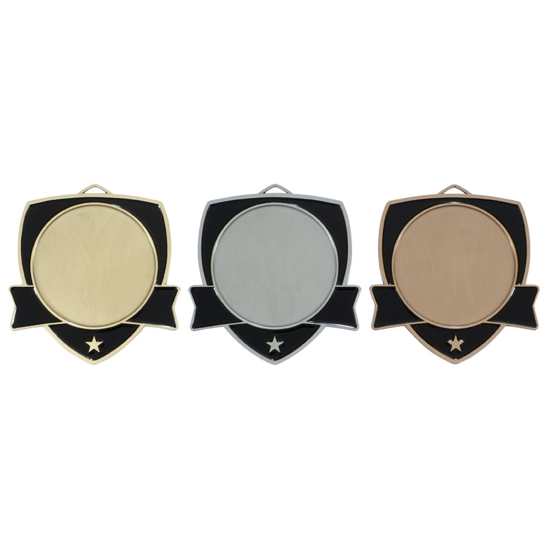 The Varsity medal series features a ribbon accent, bold text, and a shiny black enamel shield bordering your custom logo or design. Choose from goldtone, silvertone, or bronzetone, and 37 ribbon colours.